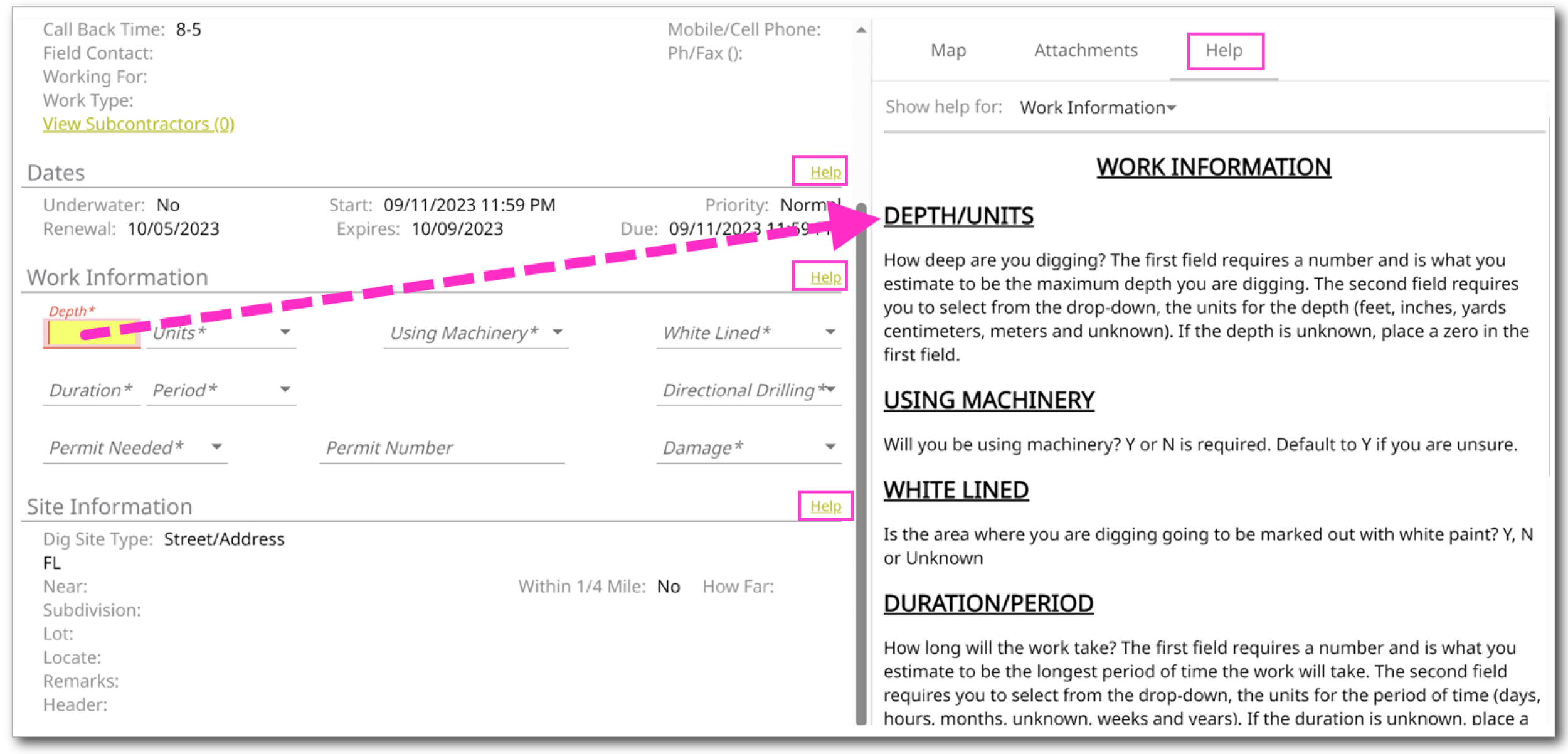 The Help Section is updated for easier access while completing a ticket. Help is now displayed in each section of the ticket (Excavator information, Dates, Work information and Site Information). It also appears in the original top right tab position.